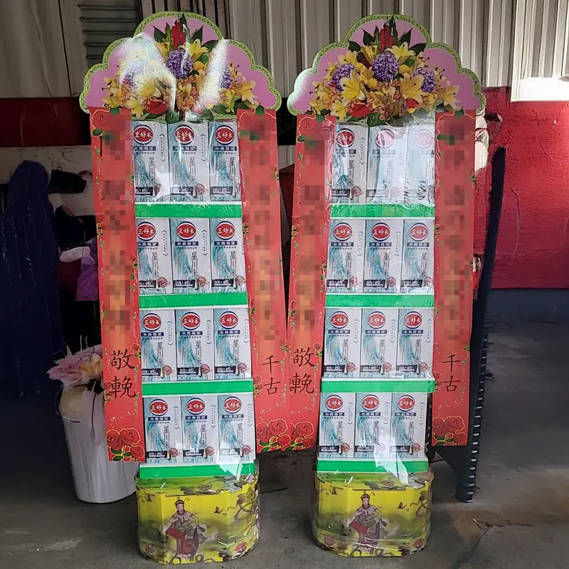 罐頭塔是親友與家屬為表達哀悼思念而準備的喪用商品,常用於祭祀與追思儀式,象徵對逝者的緬懷與祝福。