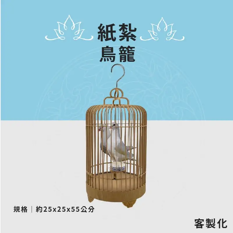 此款為:客製紙紮鳥籠 ※材質:精緻紙材 ※台灣製造、品質優良可靠 ※紙紮用品附受用紙、封條 ※紙紮屋附地契、女僕、管家、司機 ※適用場地:自宅、棺內、金爐、殯儀館、火化場