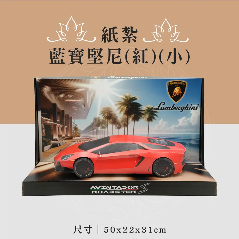此款為:紙紮藍寶堅尼(紅)(小) ※材質:精緻紙材 ※台灣製造、品質優良可靠 ※紙紮用品附受用紙、封條 ※紙紮屋附地契、女僕、管家、司機 ※適用場地:自宅、棺內、金爐、殯儀館、火化場