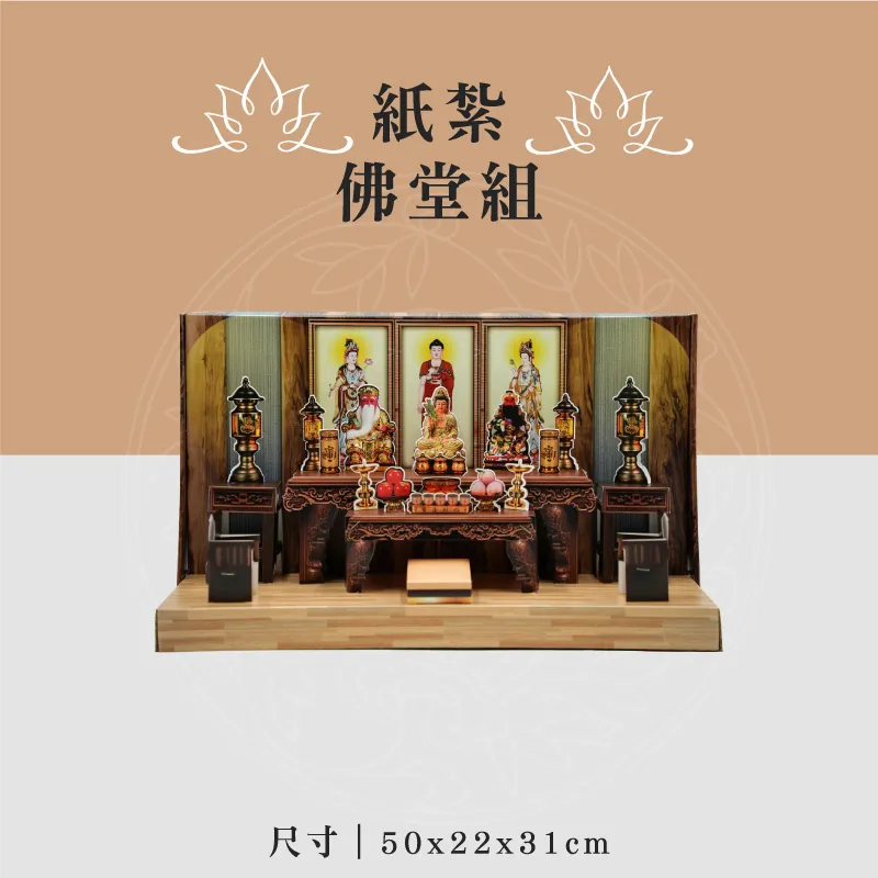 此款為:紙紮佛堂組 ※材質:精緻紙材 ※台灣製造、品質優良可靠 ※紙紮用品附受用紙、封條 ※紙紮屋附地契、女僕、管家、司機 ※適用場地:自宅、棺內、金爐、殯儀館、火化場