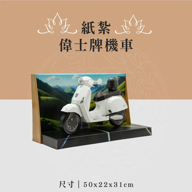 此款為:紙紮偉士牌機車 ※材質:精緻紙材 ※台灣製造、品質優良可靠 ※紙紮用品附受用紙、封條 ※紙紮屋附地契、女僕、管家、司機 ※適用場地:自宅、棺內、金爐、殯儀館、火化場