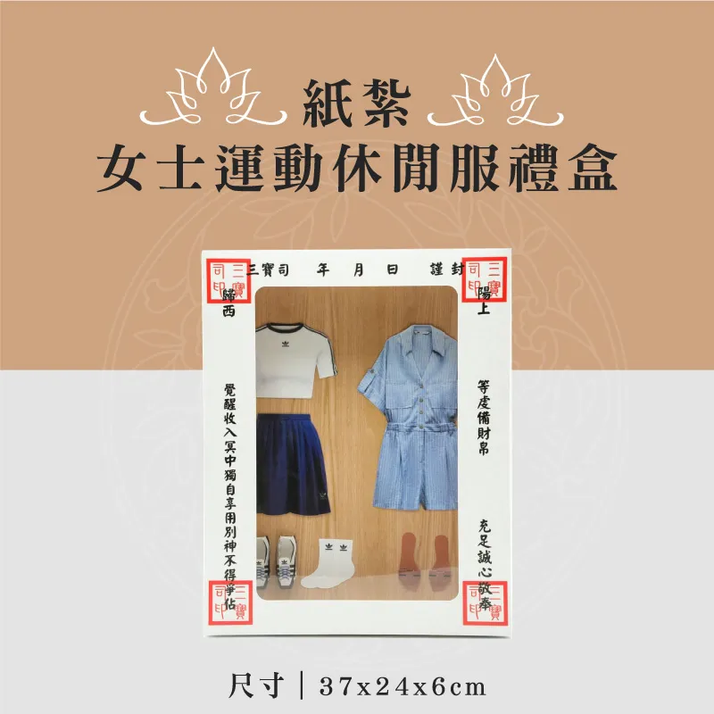 此款為:紙紮女士運動休閒服禮盒 ※材質:精緻紙材 ※台灣製造、品質優良可靠 ※紙紮用品附受用紙、封條 ※紙紮屋附地契、女僕、管家、司機 ※適用場地:自宅、棺內、金爐、殯儀館、火化場