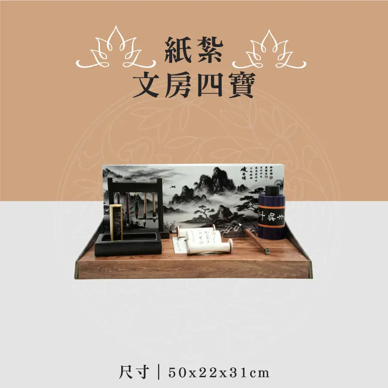 此款為:紙紮文房四寶 ※材質:精緻紙材 ※台灣製造、品質優良可靠 ※紙紮用品附受用紙、封條 ※紙紮屋附地契、女僕、管家、司機 ※適用場地:自宅、棺內、金爐、殯儀館、火化場