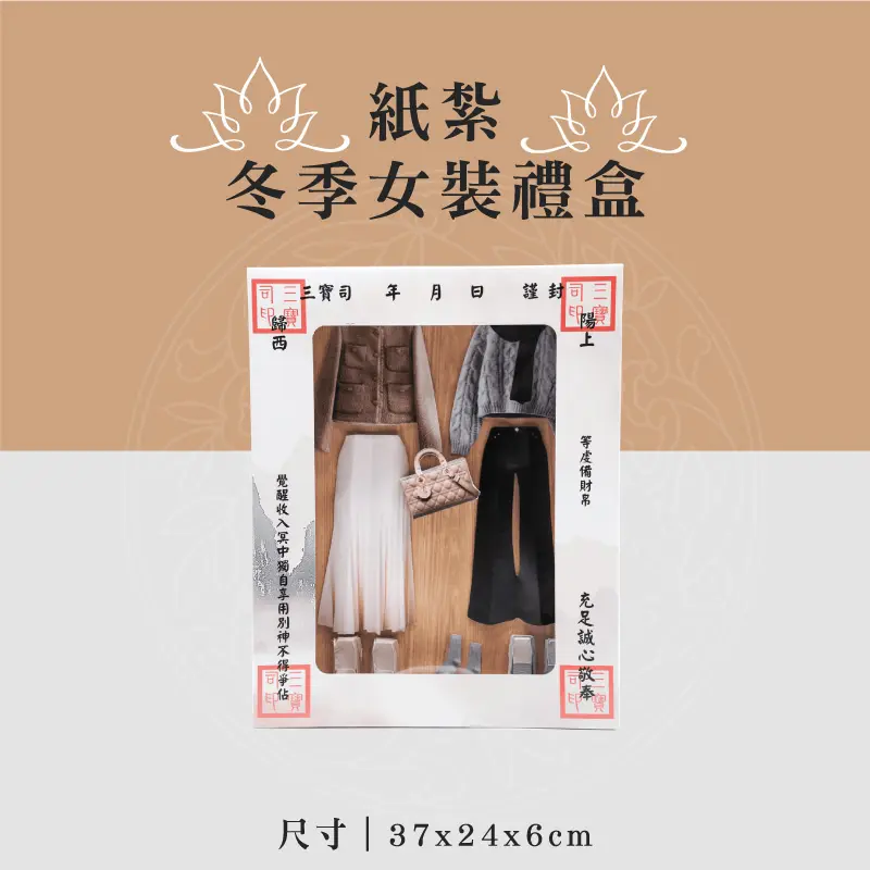 此款為:紙紮冬季女裝禮盒 ※材質:精緻紙材 ※台灣製造、品質優良可靠 ※紙紮用品附受用紙、封條 ※紙紮屋附地契、女僕、管家、司機 ※適用場地:自宅、棺內、金爐、殯儀館、火化場