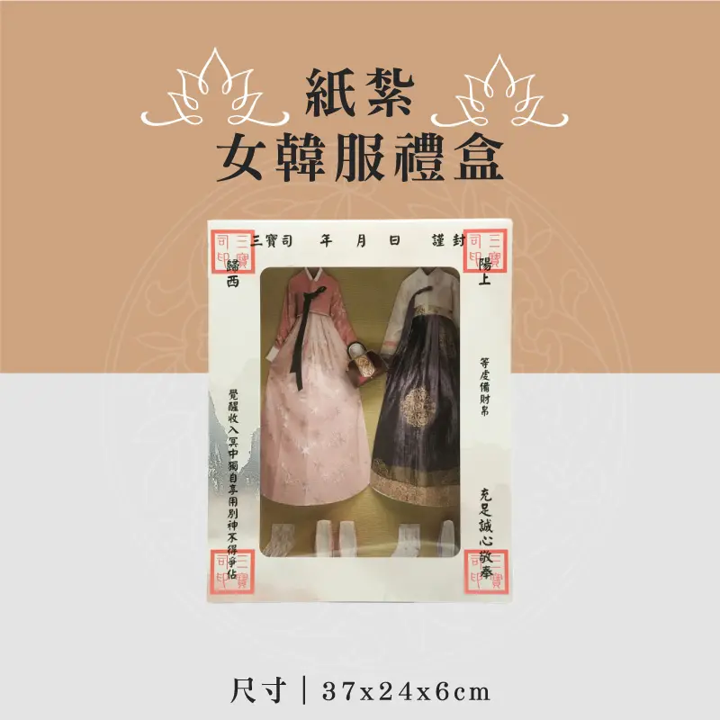 此款為:紙紮女韓服禮盒 ※材質:精緻紙材 ※台灣製造、品質優良可靠 ※紙紮用品附受用紙、封條 ※紙紮屋附地契、女僕、管家、司機 ※適用場地:自宅、棺內、金爐、殯儀館、火化場
