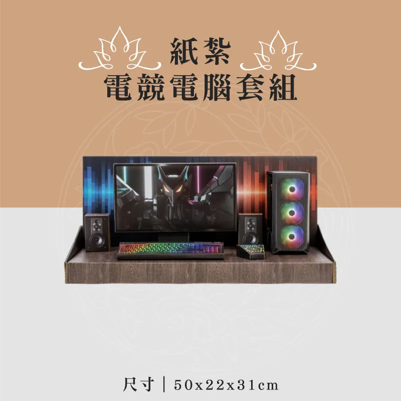 此款為:紙紮電競電腦套組 ※材質:精緻紙材 ※台灣製造、品質優良可靠 ※紙紮用品附受用紙、封條 ※紙紮屋附地契、女僕、管家、司機 ※適用場地:自宅、棺內、金爐、殯儀館、火化場