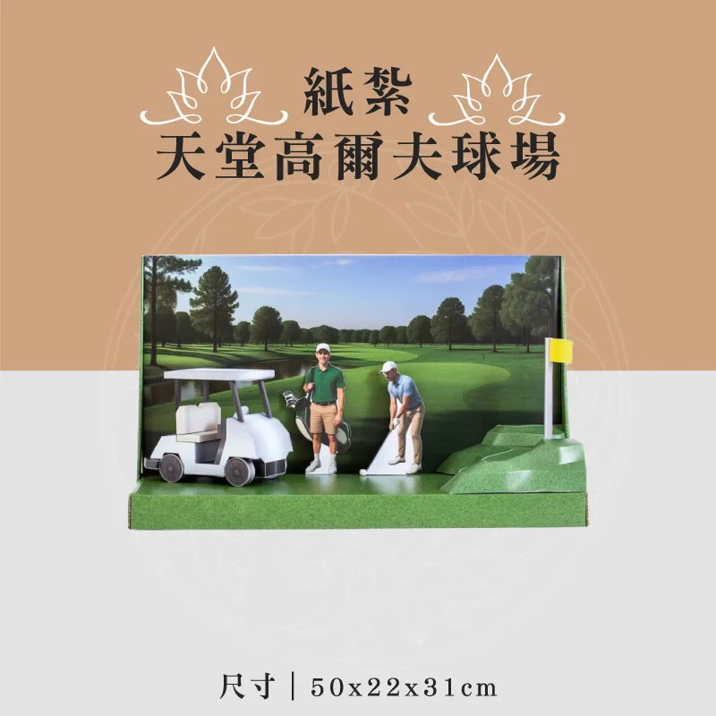 此款為:紙紮天堂高爾夫球場 ※材質:精緻紙材 ※台灣製造、品質優良可靠 ※紙紮用品附受用紙、封條 ※紙紮屋附地契、女僕、管家、司機 ※適用場地:自宅、棺內、金爐、殯儀館、火化場